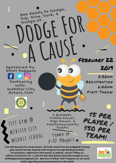 There will be three (3) tournament brackets again this year; Middle School (5th-8th grades), High School (9th-12th grades), and a Community/Family Combo bracket. Any 5th-12th grade student in Hamilton County, as well as families, businesses, non-profit or civic groups, or community members are invited to pick their team, choose their theme, dress it up, and participate in this fun, substance-free event. Individuals may also support the cause by coming to the tournament, sponsoring a team, or donating bracket prizes. Admission for spectators will be free-will-donation. All funds raised will go toward the Bee Inspired Program through Building FamiliesWebster City Rotary Club will be partnering on the SHIFT Happens efforts again this year, as their February Civic Project!