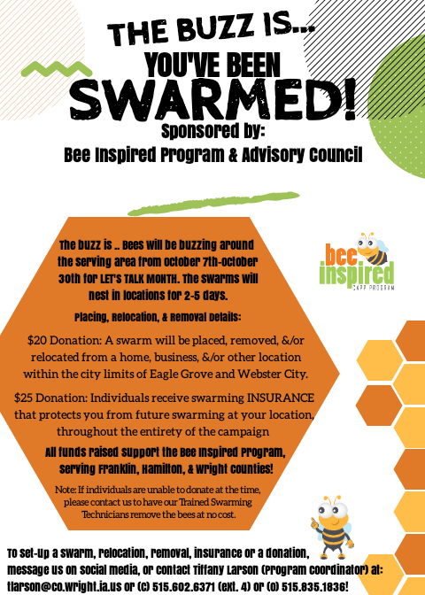 The buzz is swarms of bees will be making their appearance across Hamilton and Wright Counties thanks to the Bee Inspired CAPP Program through Building Families, and the Program’s Advisory Council. The bees will be buzzing around the serving area from October 7th-October 30th, with the swarms nesting in yards for two to five days. There will be at least one swarm of bees making their way around both counties, within the city limits of Webster City and Eagle Grove.