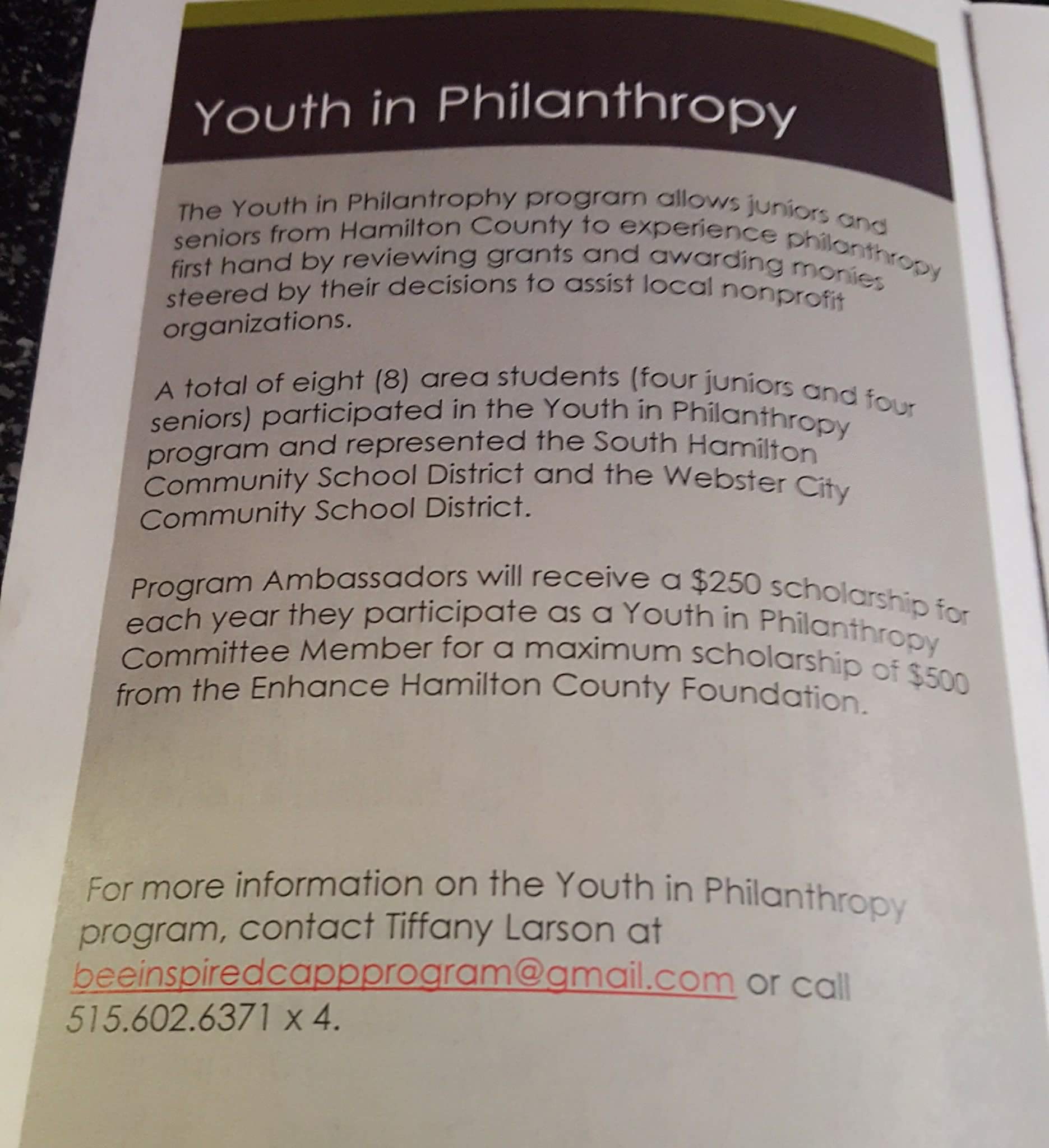 - For more information on the Youth in Philanthropy program, contact Tiffany Larson (Bee Inspired Program Coordinator), Committee Chair, at tlarson@co.wright.ia.us or by calling (o) 515.602.6371 x 4 (c) 515.835.1836. For more information about the Enhance Hamilton County Foundation, the tools they offer the YiP Program, or additional questions, feel free to visit their website at http://www.enhancehamiltoncounty.org, or contact Darcy Swon at 515.835.0437 or via email at dswon@enhancehamiltoncounty.org.